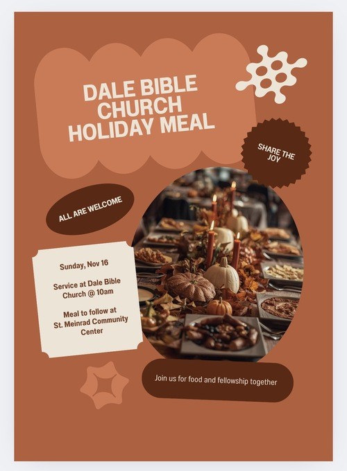 DBC Holiday Meal: Church Service will start at 10AM on Sunday, November 16th!! Plan to join us for our annual Holiday Meal right after service at the St. Meinrad Community Center.